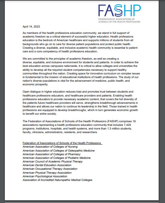 Open dialogue in higher education reduces bias and promotes trust between students and healthcare professions educators, and healthcare providers and patients. Enabling health professions educators to provide necessary academic content, that covers the full diversity of the patients future healthcare providers will serve, strengthens breakthrough advancements in healthcare and allows our nation to continue its leadership in the field. Those trained in health professions are equipped to develop breakthroughs, which in turn generates economic growth to benefit our entire society.