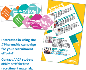 • Pharmacy Is For Me (Pharm4Me) recruitment campaign. AACP leads this national effort to promote the field of pharmacy. It provides students, parents and educators with interactive tools, first-person testimonials and information about what options exist, demonstrating all the different career opportunities and fields that someone who goes into pharmacy could potentially pursue. Part of AACP’s strategic plan included rebranding the Pharm4Me Web site and revamping its social media platform to make the campaign more widespread.