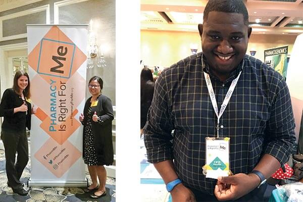 Left: Alex Aljets and Hetty Ha, National Association of Advisors for the Health Professions liaisons to AACP, pose with a new Pharmacy is Right For Me display banner. Right: Jeffrey Ekoma, AACP policy and professional affairs manager, showcases Pharmacy Is Right For Me-branded materials at the HOSA Future Health Professionals conference, this June in Orlando.