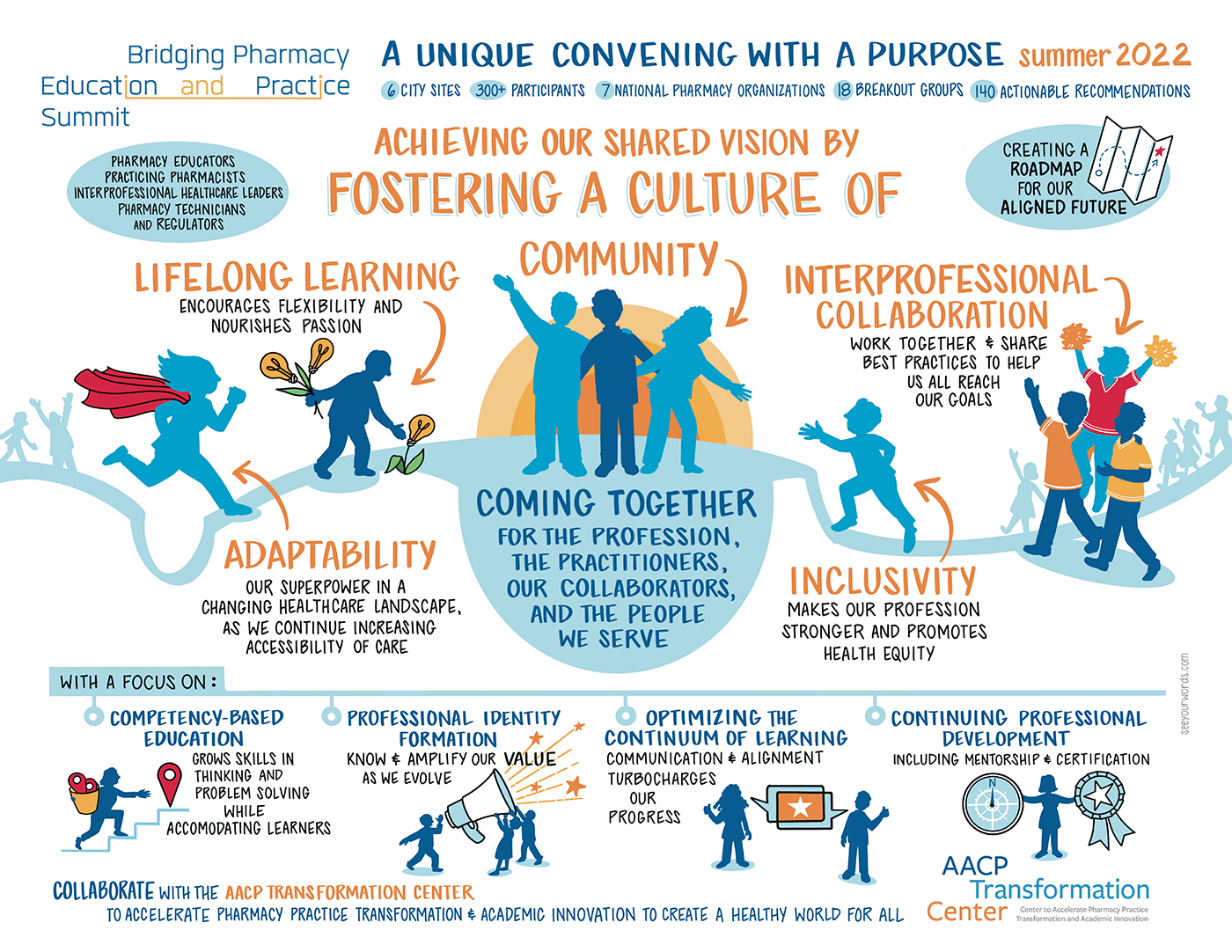 AACP worked with a graphic recorder, Jo Byrne, to create a visual map of the BPEP Summit, highlighting the purpose and conversations that took place around the four topics as well as the importance of lifelong learning, interprofessional collaboration, adaptability and inclusivity.