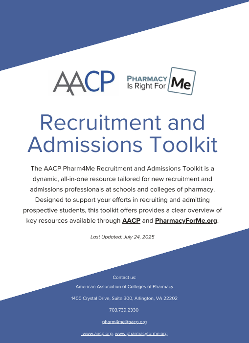 The AACP Pharm4Me Recruitment and Admissions Toolkit is a dynamic, all-in-one resource tailored for new recruitment and admissions professionals at schools and colleges of pharmacy. Designed to support your efforts in recruiting and admitting prospective students, this toolkit provides a clear overview of key resources available through AACP and PharmacyForMe.org.